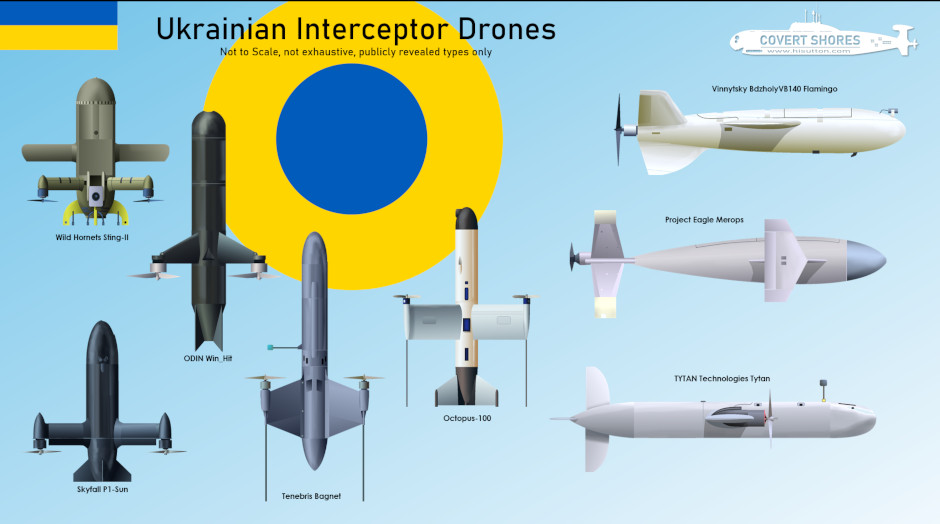 Ukraine is deploying a growing arsenal of purpose-built interceptor drones designed to counter enemy reconnaissance and strike drones. Among the most pressing threats are Russia’s Shahed/Geran and Gerbera systems. The interceptor drones continue to evolve, ranging from modified high-performance quadcopters to streamlined, projectile-like designs, and even a handful of fixed-wing types.
